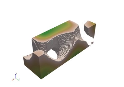 これで,新しい threshed オブジェクトに入力データセットのしきい値が設定されたバージョンがあります.フィルタの実行方法を変更するためにどのようなキーワード引数を使用できるかを調べるには, help(dataset.threshold) またはIPython環境で shift+tab を使用してPyVistaオブジェクトに付加されたフィルタのdocstringを出力します.